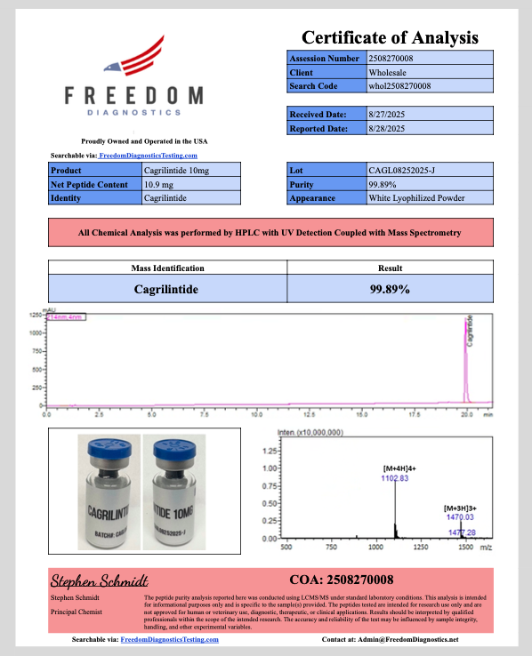 Cagrilintide is a long acting amylin analog evaluated for appetite, gastric motility, and metabolic synergy research.